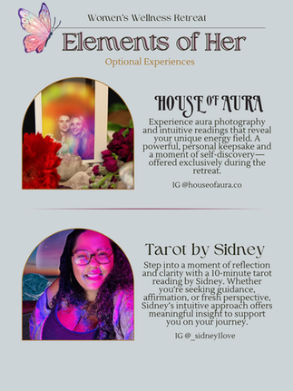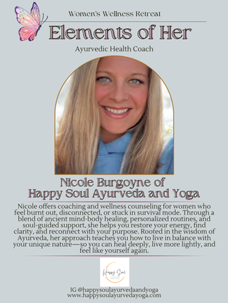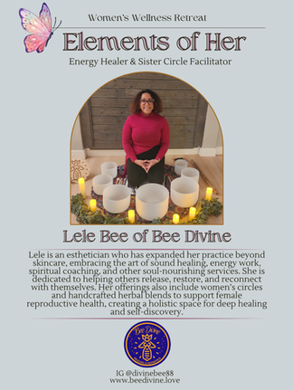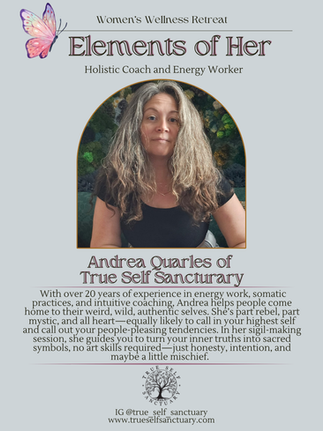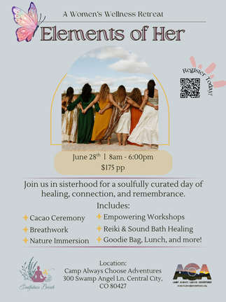 Join us for Elements of Her, a soulfully curated full-day women's wellness retreat designed to reconnect you with your inner wisdom, the rhythms of nature, and the power of sisterhood. Together, we’ll explore the elements—through nourishing practices that support your body, mind, and spirit.
